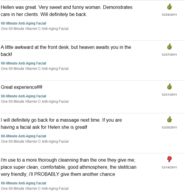 1. Absolutely loved it there. At first glance walking in I didn’t think it was going to be great but the massage and facial I received was the best one I have ever gotten, and I have gone to some high end spas.
